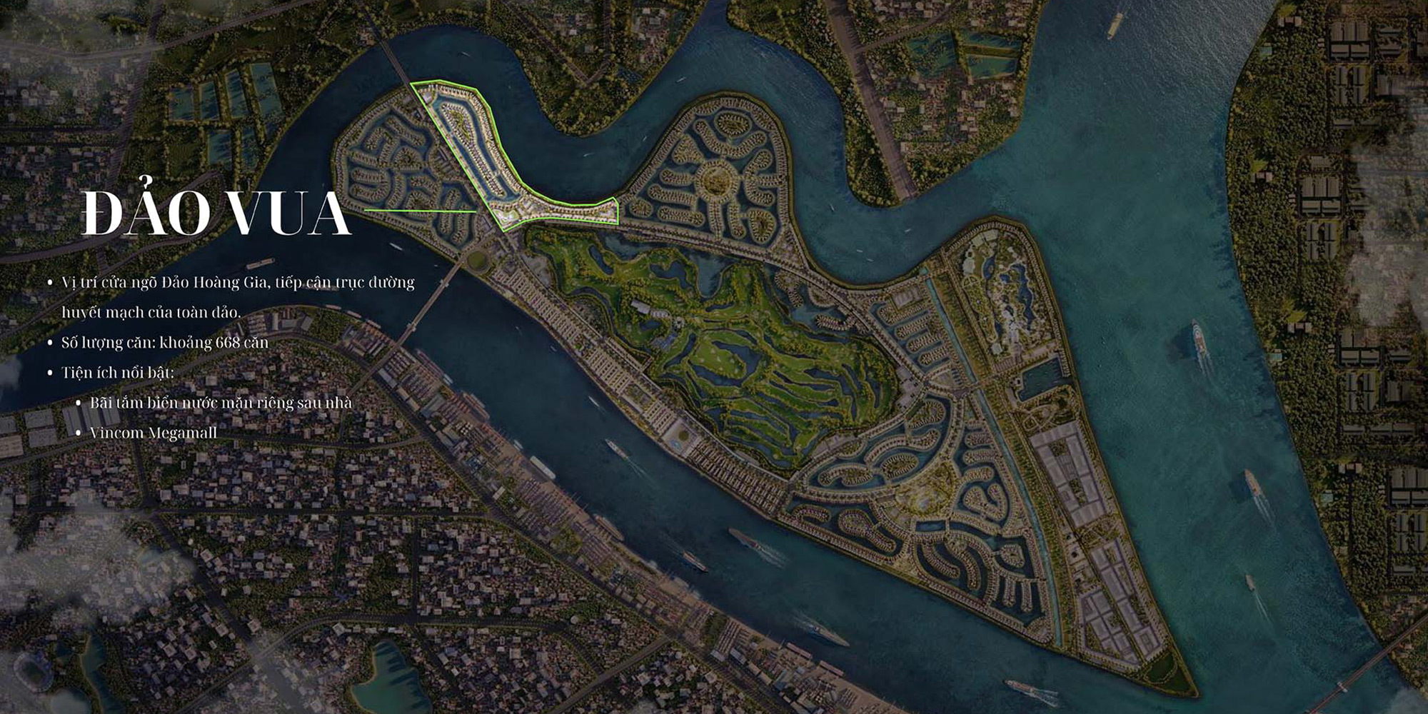 Sở hữu tọa độ “đế vương” vừa gần sông xanh, vừa gần đại lộ, phân khu Đảo Vua chính là sự kết hợp hoàn hảo của 2 phong cách sống nghỉ dưỡng & sôi động 2 trong 1. Bên cạnh lợi thế nằm tiếp giáp sông Ruột Lợn, phân khu Đảo Vua còn sở hữu riêng công viên nội khu mang phong cách “cung đình” (Ngự Hoa Viên) nằm tại chính giữa phân khu và công viên nhiệt đới nằm dọc theo sông Ruột Lợn. Cộng thêm lợi nằm ôm trọn trung tâm thương mại Vincom Mega Mall sầm uất, cư dân Đảo Vua sẽ được tận hưởng trọn vẹn cuộc sống “All in one” tiện nghi cũng như chất sống xanh phóng khoáng và đẳng cấp.