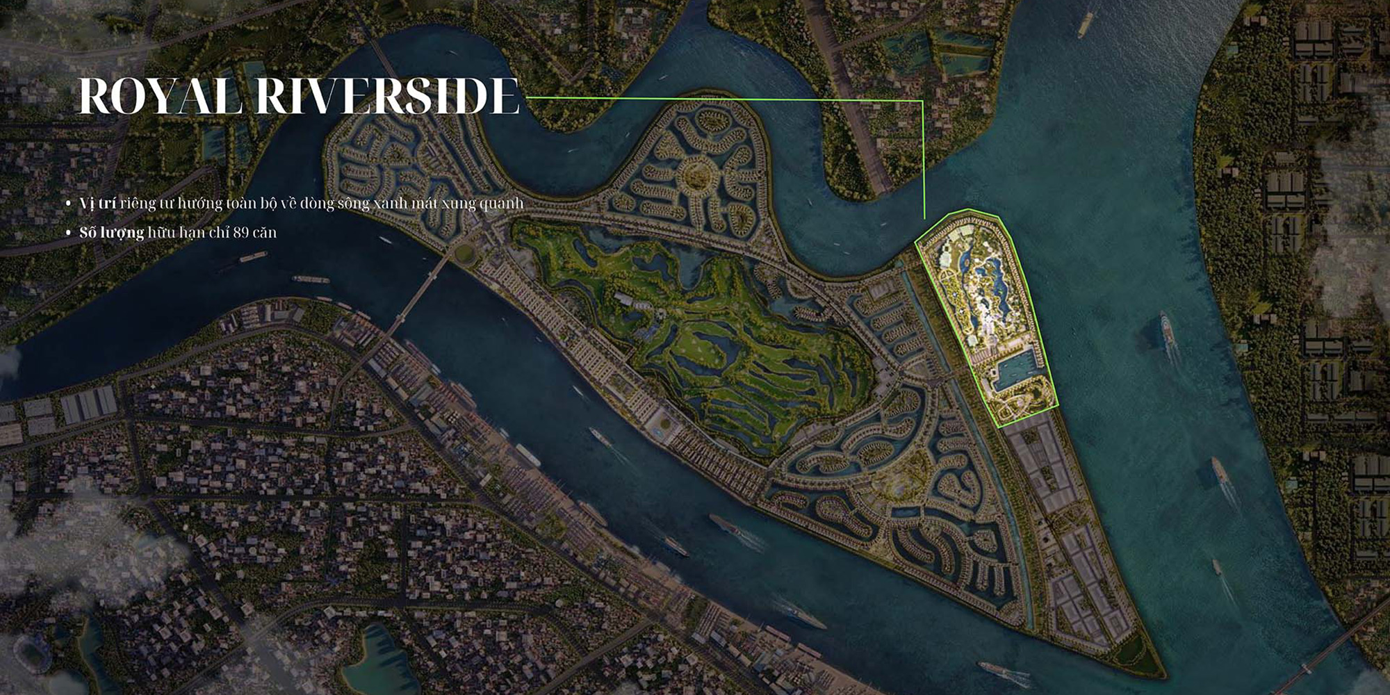 Phân khu Royal Riverside nằm dọc theo sông Bạch Đằng rộng lớn, là phân khu đẳng cấp bậc nhất thành phố đảo Vinhome Royal Island. Tại nơi đây, 89 căn biệt thự đơn lập thượng hạng nằm ôm trọn 3 kỳ quan công viên VinWonders Royal Park, học viện cưỡi ngựa hoàng gia, bến du thuyền hạng sang, cùng với tầm nhìn panorama đẳng cấp bao quát toàn cảnh sông Bạch Đằng, được ví như 89 viên kim cương quý giá dành riêng cho 89 chủ nhân thành đạt xuất sắc.